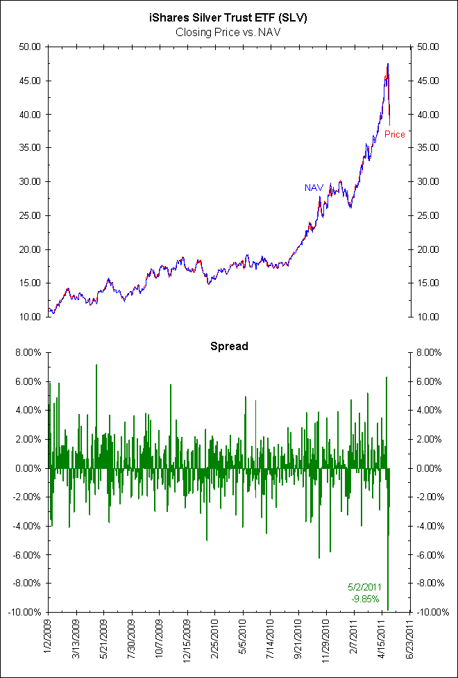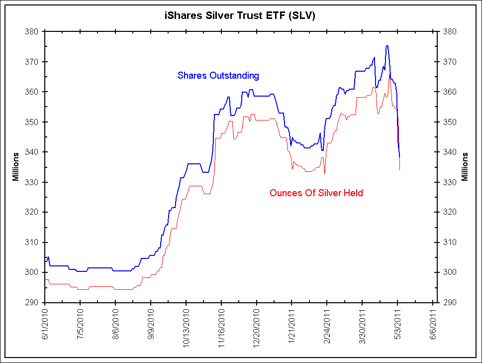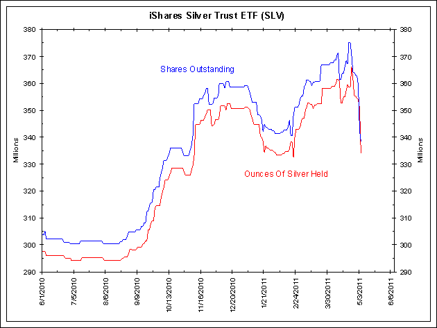Instead we have seen the opposite. Few signs of irrational buying of SLV were visible during silver’s advance, but now that prices broke sharply to the downside we have seen motivated SLV sellers. They have pushed the price of SLV to a significant discount, prompting the ETF manager to buy SLV, thus reducing the shares outstanding, and sell bullion to pay for them.