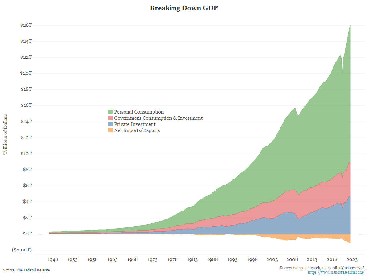 Interestingly, personal consumption continues to make up a larger portion of GDP as time progresses. Prior to the 1990s it typically only made up 60% of GDP.