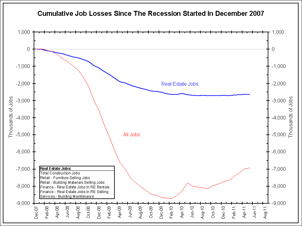 Below is a chart showing the cumulative losses in real estate jobs since housing peaked. This industry has yet to recover from a jobs standpoint.