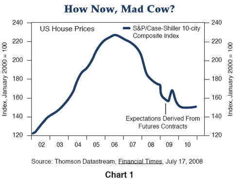 First, home prices need to bottom and stop creating more losses. This is why Q2 losses rival Q1. Home prices continued to decline and created more losses. As the chart below shows, the Case/Shiller Index is still falling and the futures market is expecting further declines into 2010. Yes, the futures market’s forward-looking prices can be wrong (as we noted they were with crude oil earlier this week), but hope that home prices are bottoming now are just that, hope.