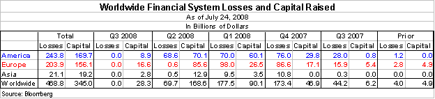 The answer is only two of nearly 50 European financial institutions that have previously reported losses have released Q2 financial statements. These losses are still to be reported. If America is a good guide, and it has been in the past, then European financial institutions will report some $90 billion of losses when the Q2 earnings statements come rolling in. Combine this with the $10 billion in losses from the 20 Asian financial institutions that have yet to report, and total financial system losses will near $600 billion when all this settles out.
