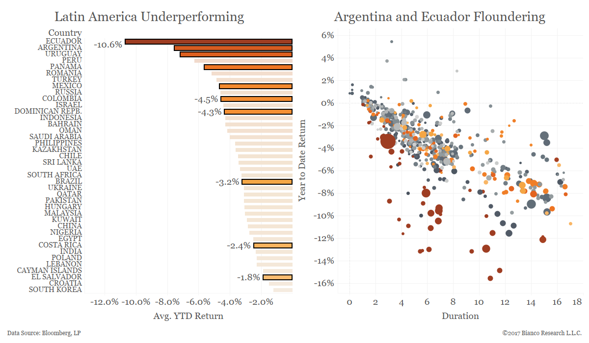The next chart shows average year-to-date total returns on the left with Latin American nations highlighted. The scatter plot on the right shows 2018 total return by duration for each issue in the index. Argentina and Ecuador, both in darker shades of orange, account for the steepest losses, even at short durations. Other Latin American nations, highlighted in shades of orange, have managed to sidestep their neighbors’ troubles. Brazil and Costa Rica account for some of the best performers in the index.