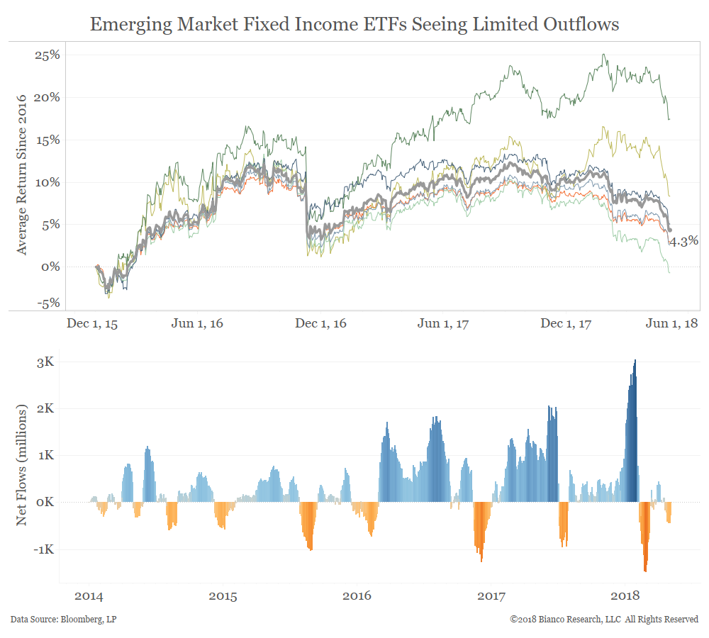 We pointed out on April 26 that emerging market ETF investors were holding the line despite 10-year Treasury yields rising above 3% briefly. There are still no signs of panic. The chart below shows that although emerging market debt ETF performance has continued to slide, net flows have stabilized over the past week. On average, emerging market debt ETFs are -2% since the beginning of April, their worst performance since the post-election collapse. Yet the reaction in ETF flows has been minimal.