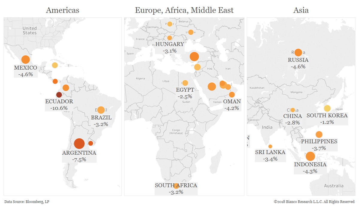 Distress in Argentina is adding to worries from trade tensions are sending emerging market debt into a tailspin. Latin American sovereigns are now the worst performing members of the Bloomberg Barclays Emerging Market Aggregate US Dollar index. The map below shows the average year-to-date return on sovereign debt by emerging market nations with at least $10 billion in total debt outstanding and excluding Venezuela. Mark size reflects total debt outstanding. Argentina comprises a larger share of the index. Ecuador (-10.6%) and Argentina (-7.5%) are at the bottom of the barrel.