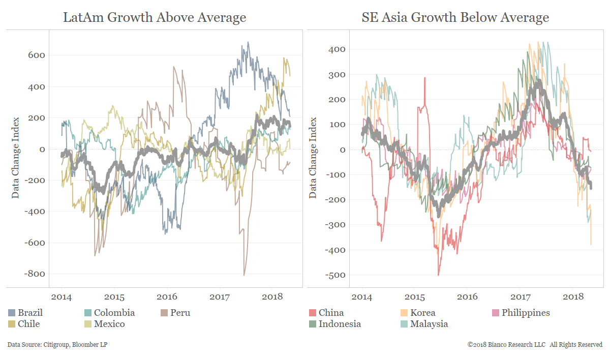 The question is whether the worst is over for Latin American emerging markets. We discussed in a recent carry trade post how the economic growth backdrop in Latin America may be more favorable. The charts below show Citigroup’s economic data change indices for emerging markets in Latin America and Southeast Asia. Importantly, this does not include Argentina which makes Latin American performance look better than it otherwise would. But excluding Argentina, Latin America is looking more resilient and still above its one-year average.
