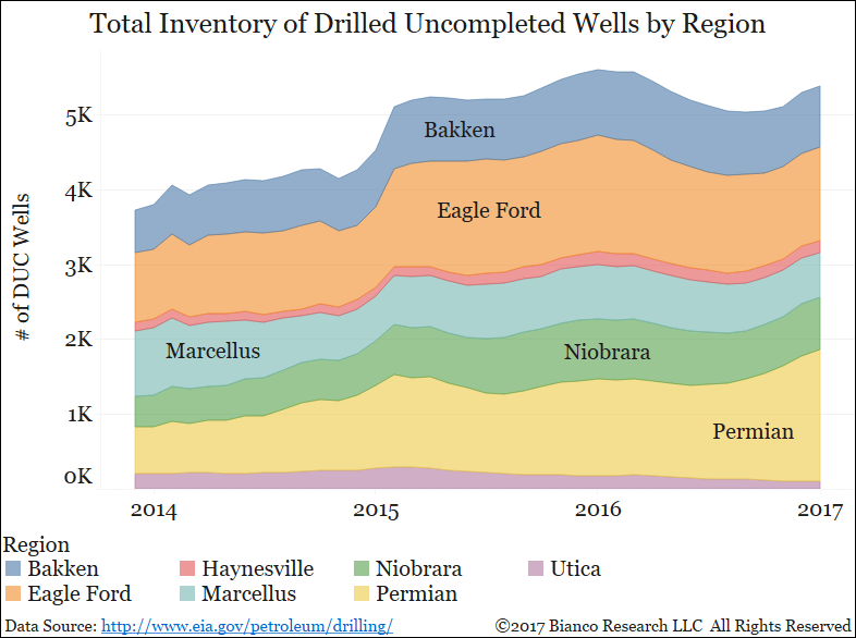 There is another critical component in the U.S. tight oil supply picture. A growing inventory of drilled but uncompleted (DUC) wells allow tight oil producers to respond very quickly when spot prices rise above their breakeven rates. DUC wells are ready to begin producing oil and only await fracturing. The Energy Information Agency produces estimates of the inventory of these drilled but uncompleted wells for each region. These are estimates and a full explanation of the methodology can be found here (PDF).
