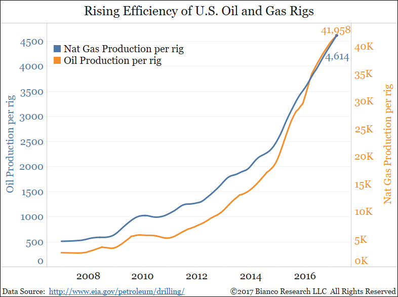 As the next chart shows, improving efficiency is helping tight oil producers in the U.S. squeeze more oil and gas out of each well. New technologies allow faster completion time for wells, and allow drilling rigs to complete clusters of wells in close proximity to each other with minimal setup costs. With production per rig accelerating higher, costs per barrel produced are falling. These falling breakeven rates are helping U.S. tight oil producers fill the gaps in global supply creating by the pullback in OPEC production.