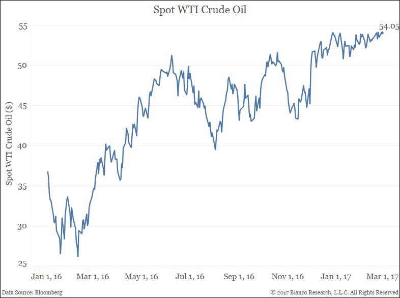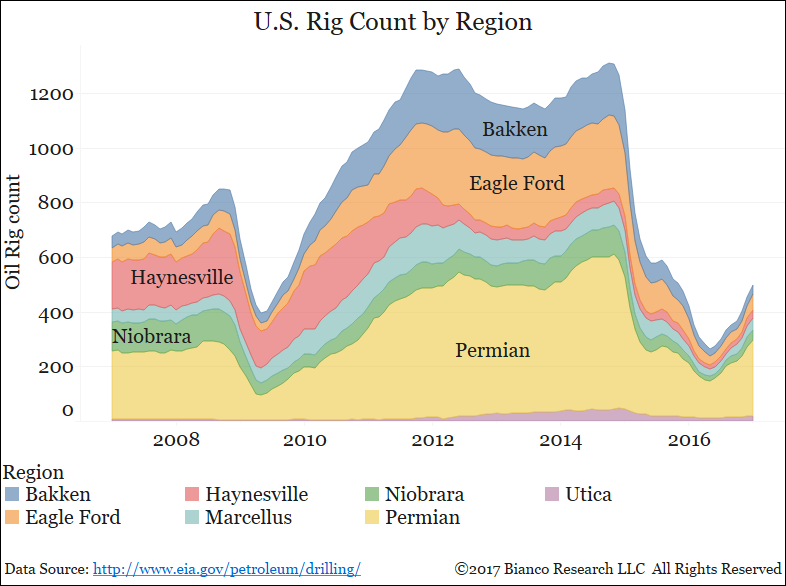 Rig counts rose quickly into year-end 2016 and are continuing to accelerate in 2017. The next chart shows rig count by region and highlights the rapid growth in the Permian Basin of west Texas. The sharp rise in drilling activity is remarkable given the modest price gains that crude oil has seen in the past 3 months.