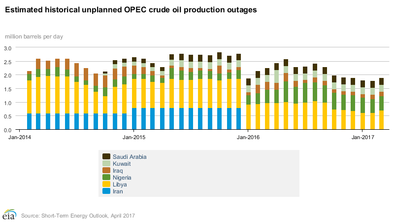 Restarted shipments from Libya will be yet another source of supply helping keep a lid on prices. The EIA reports unplanned production outages monthly and estimated 710,000 barrels per day of outages in Libya. With the Sharara and El Feel fields coming back online, about one third of that will be back on the market. The chart below is from the EIA’s April update and shows March data.