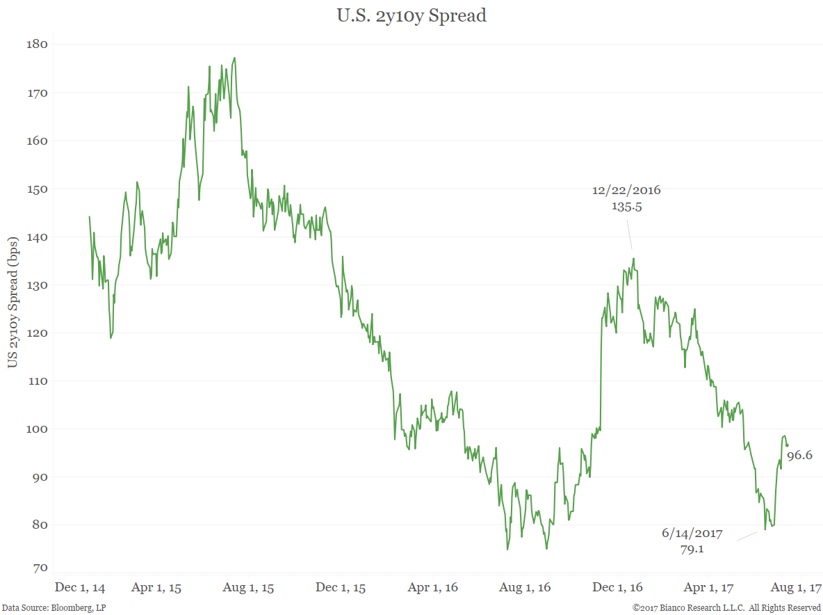 As the chart in the health care block above shows, despite strong inflows in July, financials continue to underperform at only +5.2% for the year. We noted through the second quarter that U.S. bank equities looked vulnerable to further flattening in the Treasury curve. Interest rates were already well below forecasts and expectations for net interest margins were still tied to a steeper curve. Bank investors were granted some relief as the Treasury curve steepened over the past month. The chart above shows the U.S. 2y10y spread has steepened almost 20 bps since June 14.
