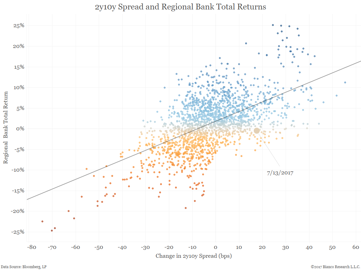 Recent steepening in the U.S. Treasury curve offers a brighter outlook for financials and especially regional banks, yet regional banks have lagged despite heavy inflows into the sector. Further steepening in the treasury curve could see regional banks outperform.