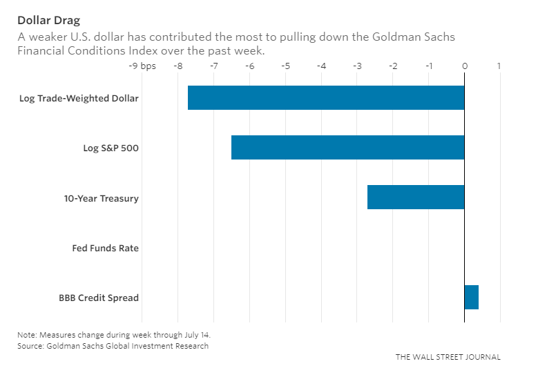 The Goldman Sachs Financial Conditions Index, a widely-watched gauge, was at its lowest since late 2014 this week. The lower the index, the looser the flow of money, based on factors like bond yields and the value of the dollar against its peers. Much of that is the result of a falling greenback. The WSJ Dollar Index, a measure of the U.S. currency against 16 others, is down 6.5% since the end of last year. The index was down another 0.6% Tuesday morning at its lowest level since October, before the presidential election spurred a big surge in the dollar.