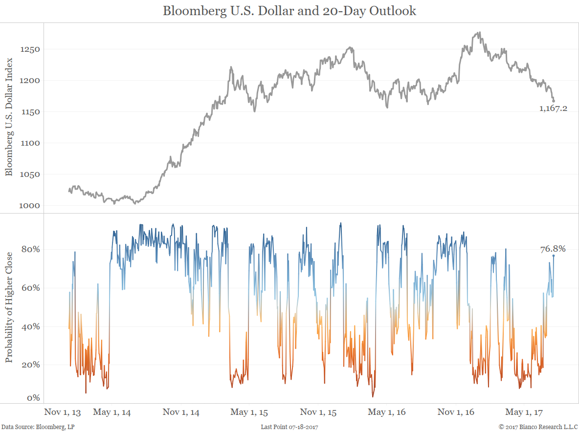 The second is that our 20-day forecast model is beginning to lean bullish for the dollar. The model estimates the probability that the Bloomberg U.S. Dollar Index will close higher in 20 days. The recent dollar selloff has seen this probability climb to 76.8%. You can read more about the model here.