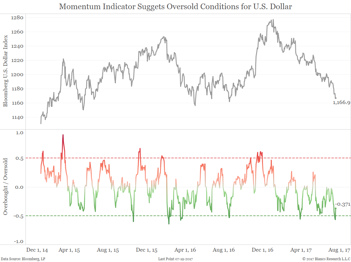 Despite agreeing that medium-to-long-term influences point toward persistent U.S. dollar weakness, we see two signs that the short-term outlook is brightening. The first is a simple momentum indicator we use to highlight overbought and oversold conditions. The chart below shows oversold conditions (indicator below -0.5) beginning to appear.