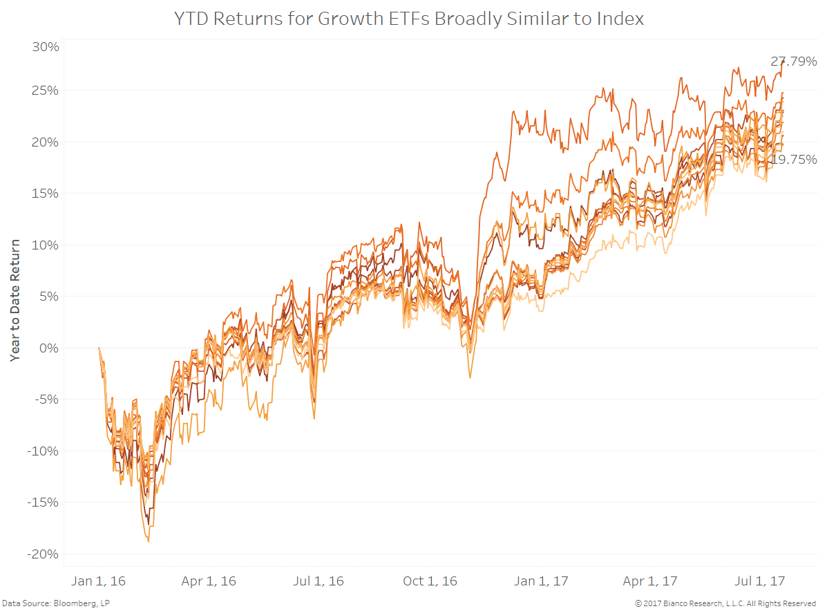 The chart below shows YTD returns for all U.S. growth equity ETFs. These range from 19-28%, reasonably close to the S&P 500 Growth Index total return of 16%.
