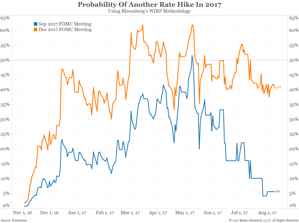 The next two charts show what the market expects from the Fed. The probability of a rate hike in September is approaching zero as the market expects the Fed to announce balance sheet reductions, and not rate hikes, at this meeting. December is now less than 50% meaning a rate hike is also not expected at this meeting.