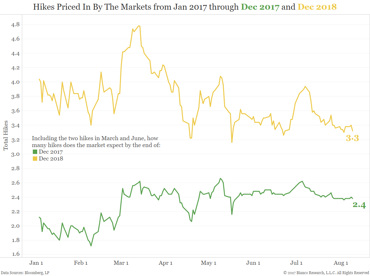 Expressed differently, see the third chart below. Two rate hikes are already done this year (March and June). The market only expects 0.4, or less than half a rate hike the rest of his year. It is pricing in 1.3 rate hikes through the end of 2018. This stands in contrast to the latest Fed “dot” chart that says 1 rate hike this year and 3 next year. In January 2016 when the Fed dots said 4 rate hikes and the market priced in less than 2 rate hikes, the Fed “caved” to market expectations and hiked only once in December 2016.