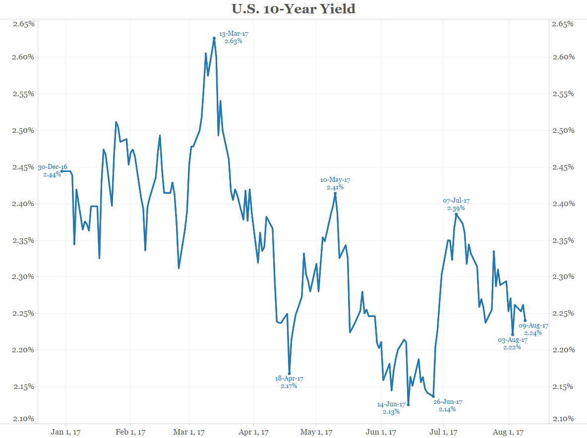 At the beginning of the year, the Wall Street’s consensus was for rates to go higher. The question was “when will 10-year yields hit 3%?”, not if. Predictably rates have gone the other way and are lower now than the start of the year. See the first chart below.