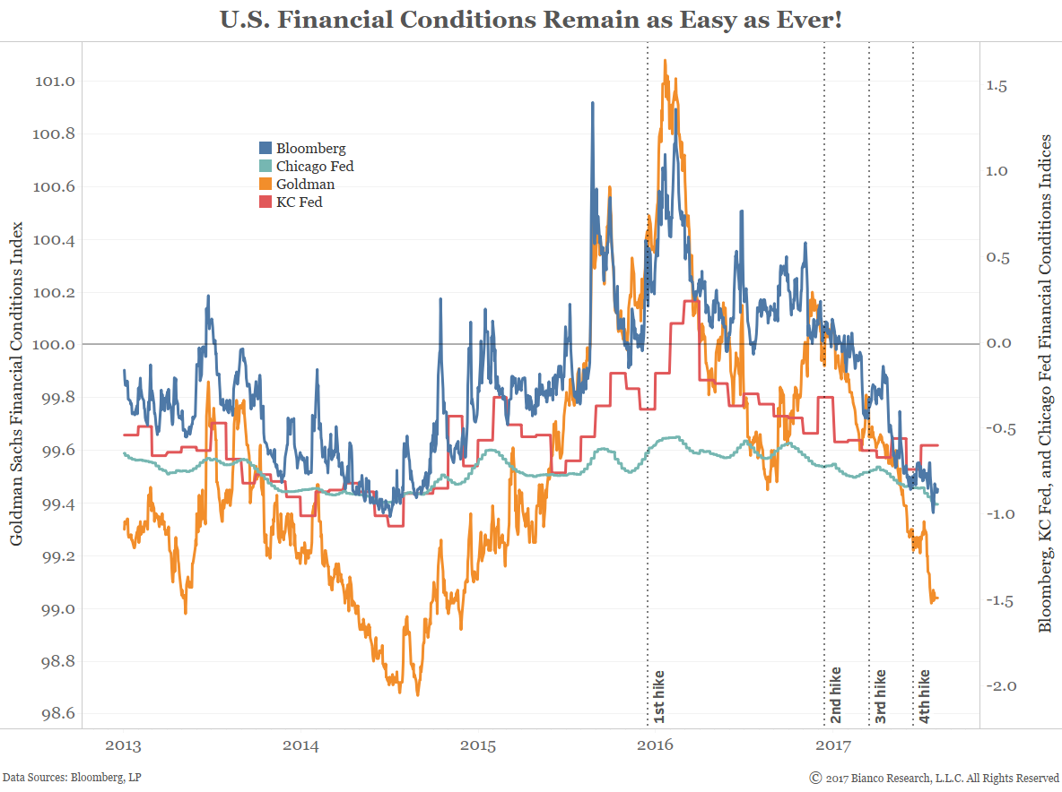 The chart below shows major financial conditions indices along with rate hikes (vertical dashed lines).