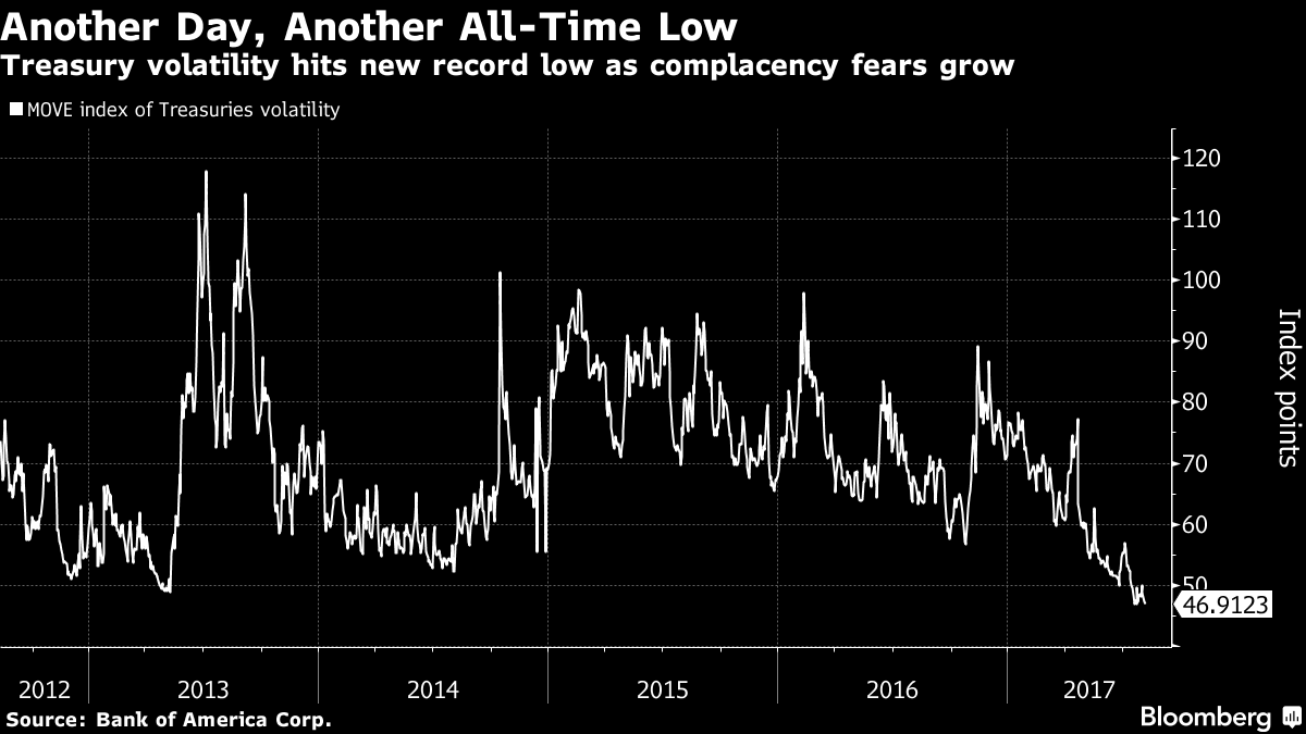 The markets are alive with the sound of ‘zzzzzz’ as the latest trading session marks yet another another record low for volatility gauges. Bank of America’s MOVE Index, which gauges volatility in the U.S. Treasury market, has tumbled to an unprecedented 46.9 at the close of Monday’s trading session. The move means investors in the world’s largest bond market are shrugging off the potential for price swings, even as two titans of the industry up their bets on an uptick in U.S. inflation.