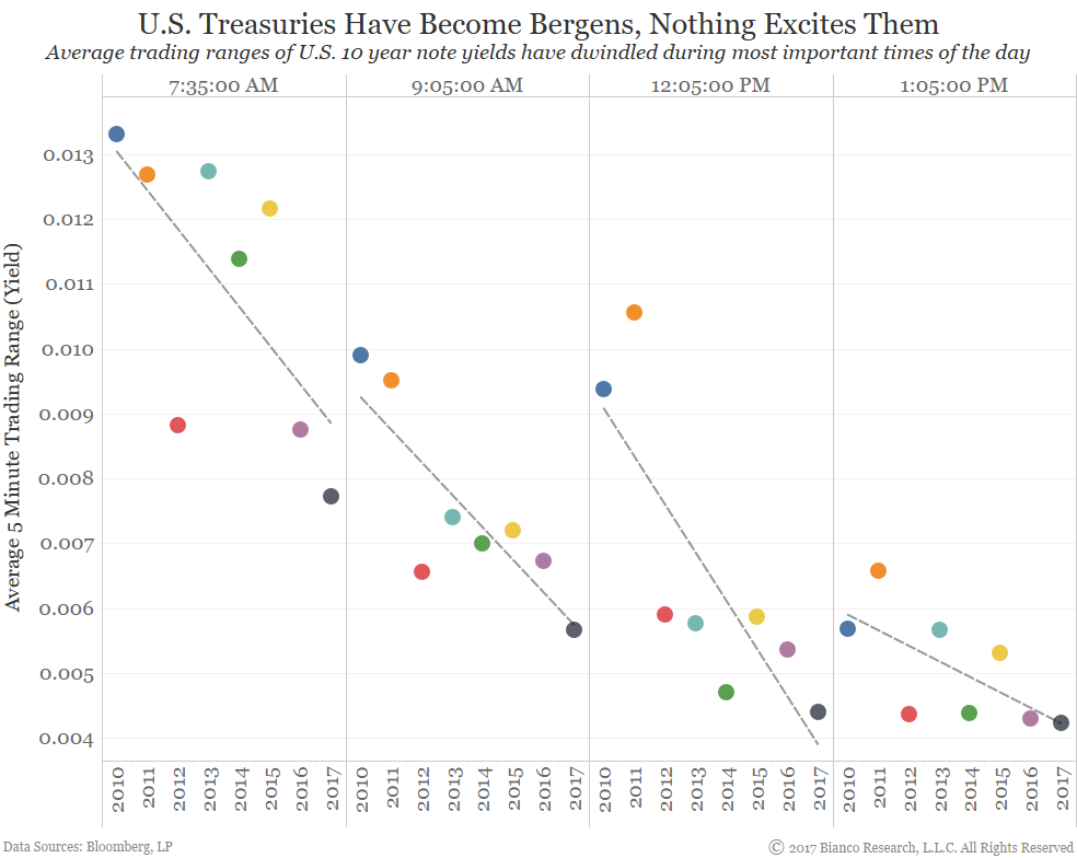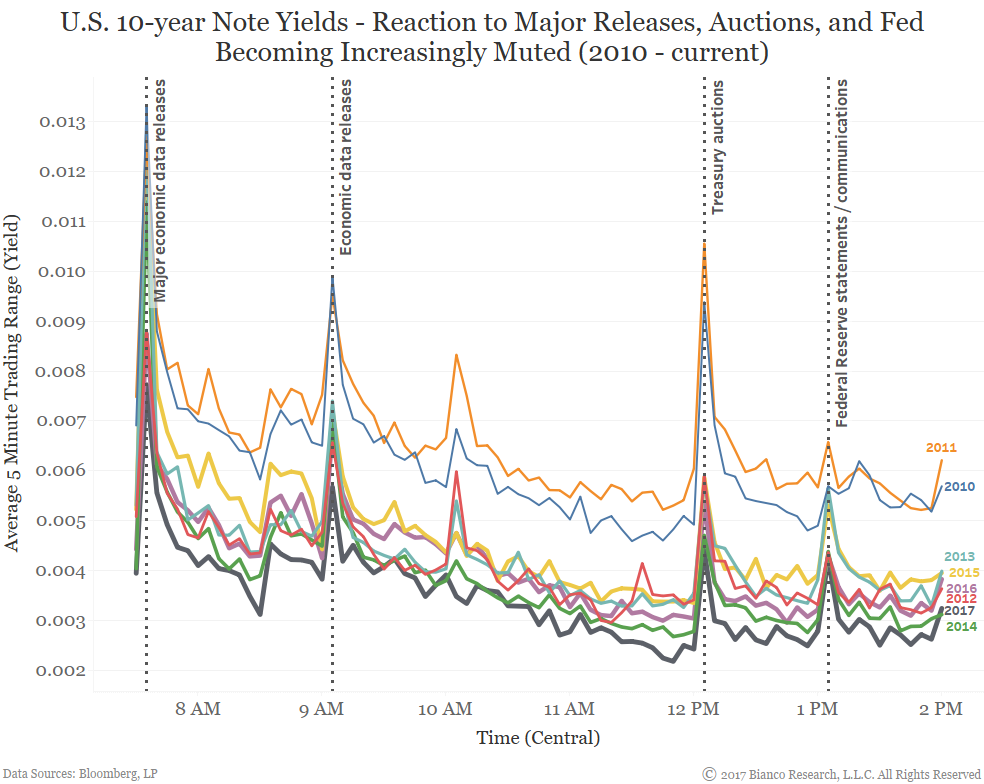 Namely, U.S. Treasuries are no longer reacting so strongly to events throughout the trading day. The chart below shows average trading ranges over five-minute intervals by U.S. 10-year note yields from 2010 to current. Note all times are central.