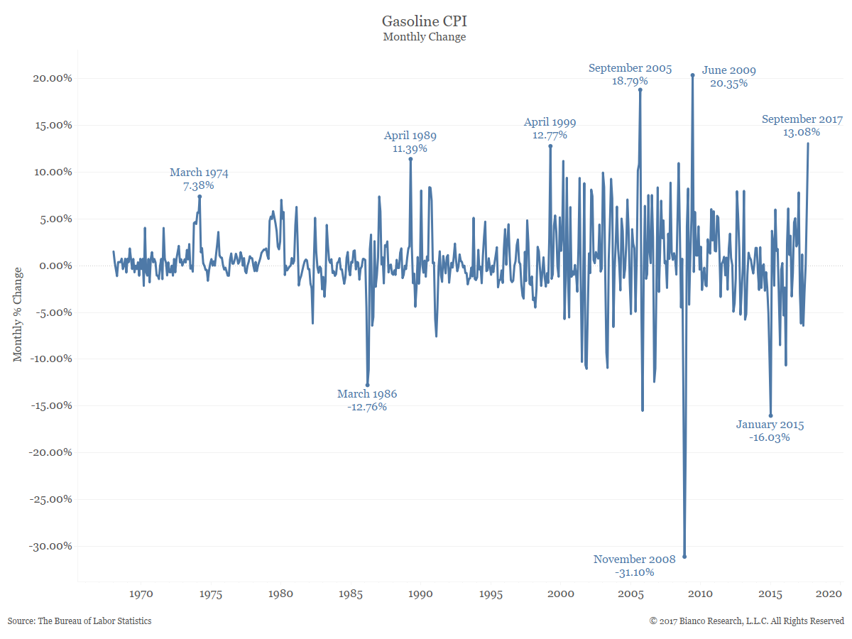 In past weeks we have talked about the hurricanes’ effect on jobs data, GDP nowcasts, and even looked at market behavior after past major hurricanes. This week’s iteration of hurricane-skewed data comes in the form of gasoline CPI.