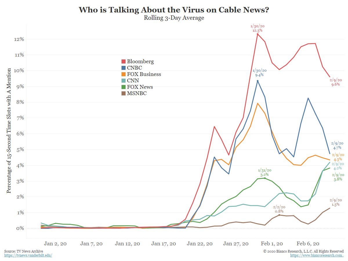 Using cable news coverage as a gauge of concern/interest, we find little to no panic with the public over the virus. This suggests that little financial market downside has been discounted.