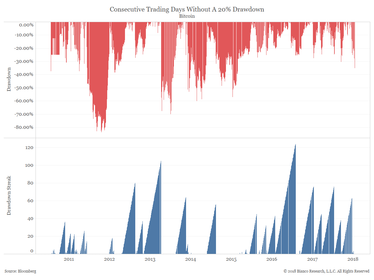 Defining a bear market as a 20% drop, the chart below shows just how often owners of Bitcoin would have to endure a bear market. While Bitcoin once made it 124 trading days (roughly six months) without a bear market during this span, this was far from the norm. More often than not, Bitcoin would enter bear market territory at least once every couple months.