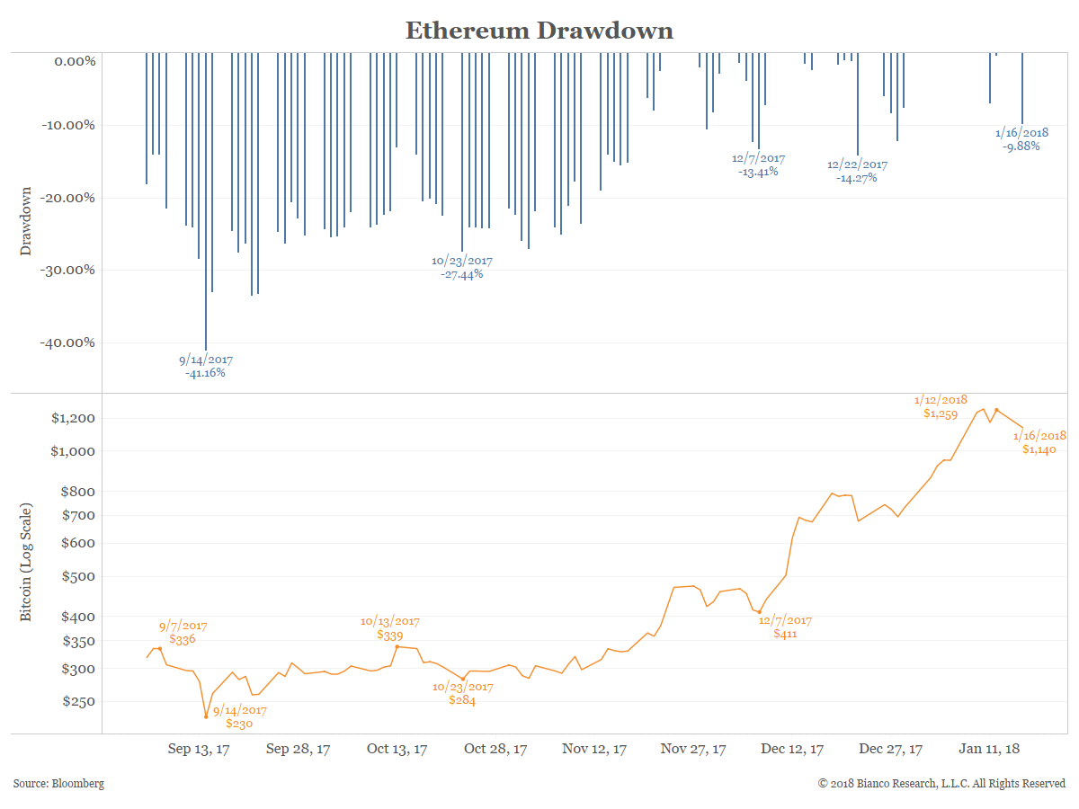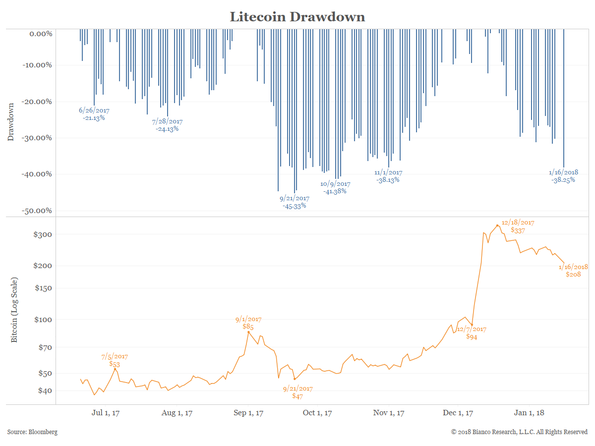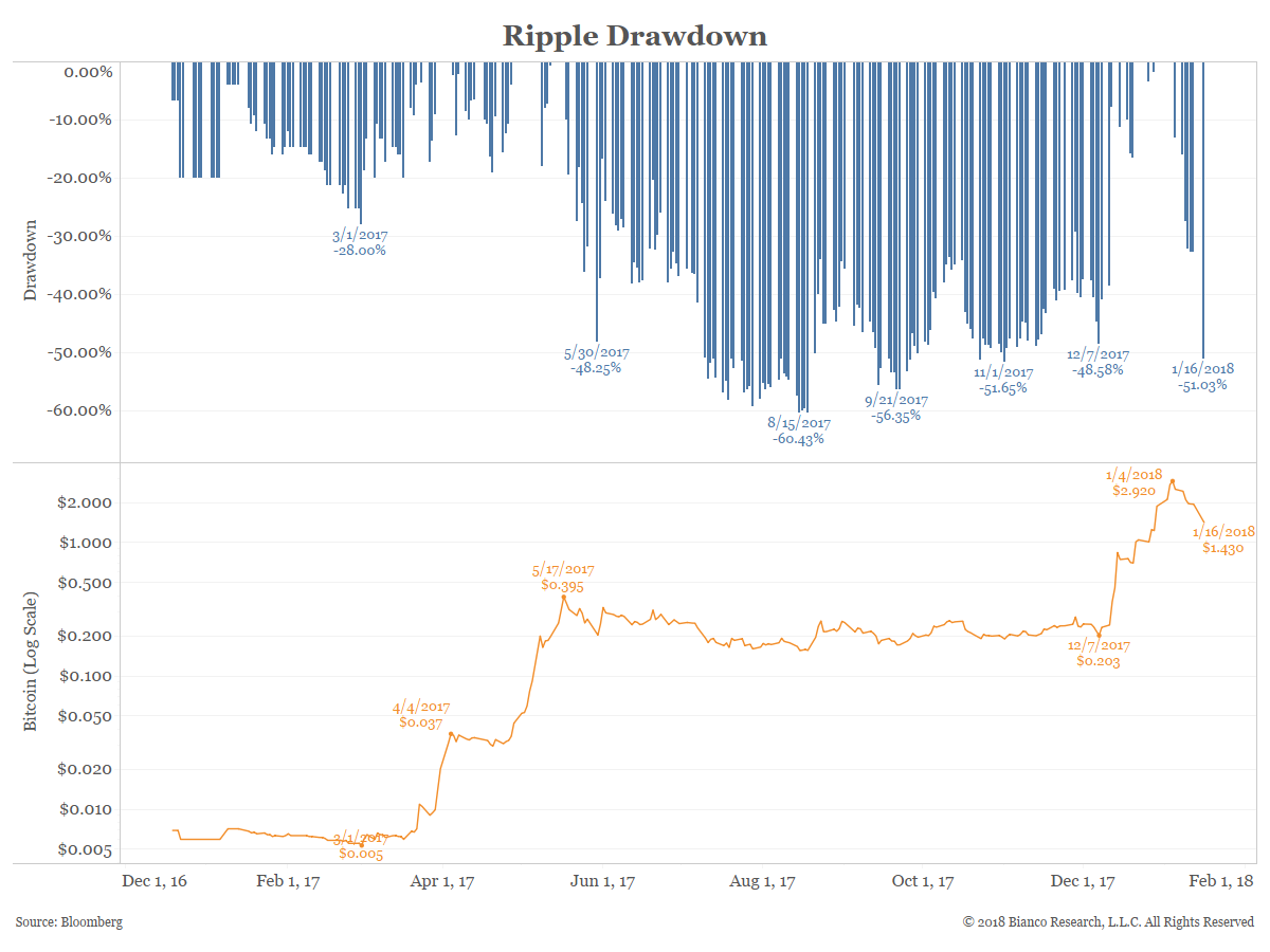 The charts below show the drawdowns of several major cryptocurrencies. Bitcoin is down over 35% from its previous peak, marking its biggest drawdown since early 2015. Meanwhile, ethereum is “only” off 9.88%. Ripple appears to be the biggest loser, down over 51% from its peak.