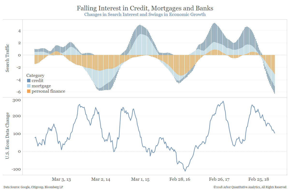 There are some common threads running through many of the recent themes we’ve discussed. One emergent feature in the global Google search trends is an accelerating fall in search interest related to credit, mortgages and personal finance (major banks). The chart below shows six-month changes in seasonally adjusted search interest over time for these three categories we created. The bottom panel shows Citigroup’s economic data change index, which measures U.S. economic growth against its one-year average.