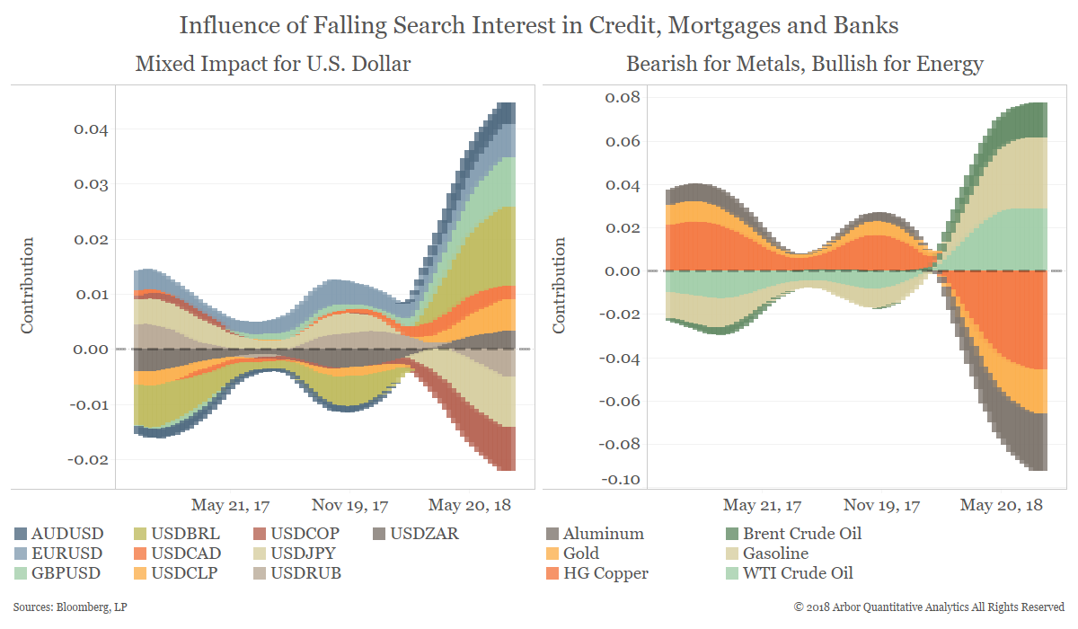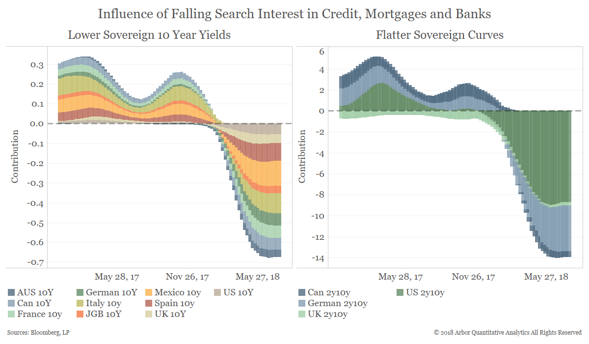 The accelerating decline in search interest for borrowing and banking is a potential threat to the pace of economic growth in the U.S. Its influence is significant across several major asset classes, favoring lower sovereign yields, flatter sovereign curves and dollar weakness against other developed-market currencies.