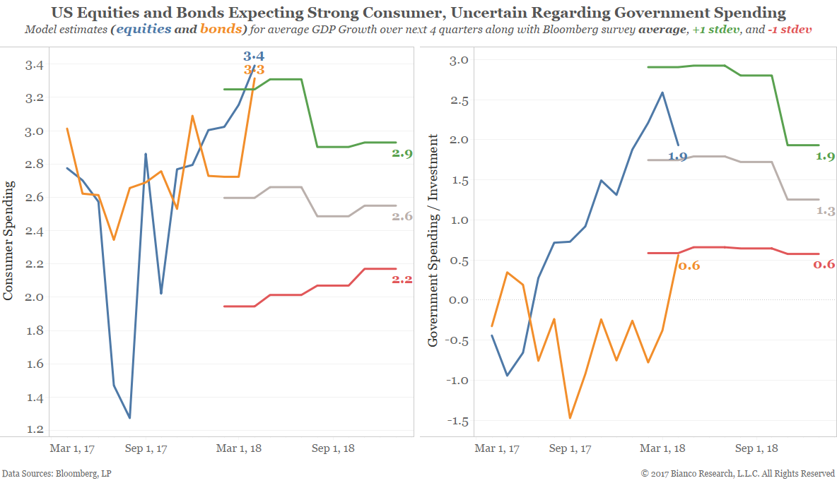 Both equity and fixed income markets are expecting rock solid consumer spending near 3.3 to 3.4%, above the highest economist’s estimate. However, bonds are not yet buying into improved government spending like equities. U.S. fixed income expects government spending to average 0.6%, well below equities at 1.9%.
