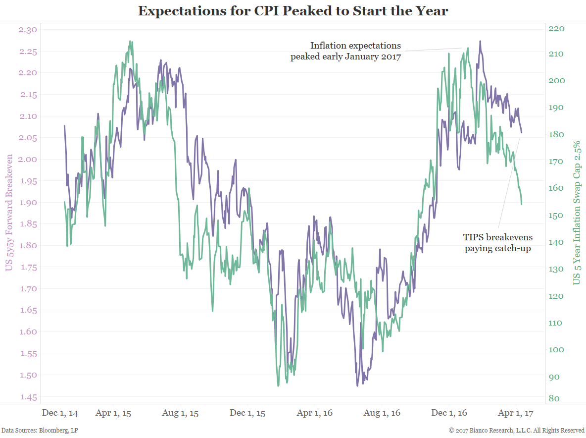 In addition, the bond market has greatly tempered inflation expectations. The chart below shows U.S. 5y5y forward breakevens and U.S. 5-year inflation swap caps (2.5%). Options markets on CPI show inflation expectations peaking to start 2017 with TIPS breakevens finally playing catch-up.