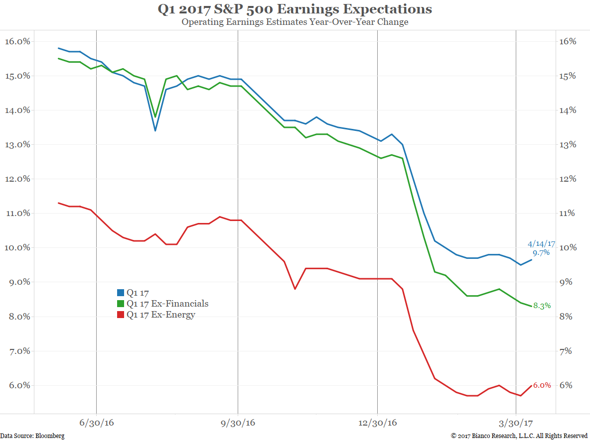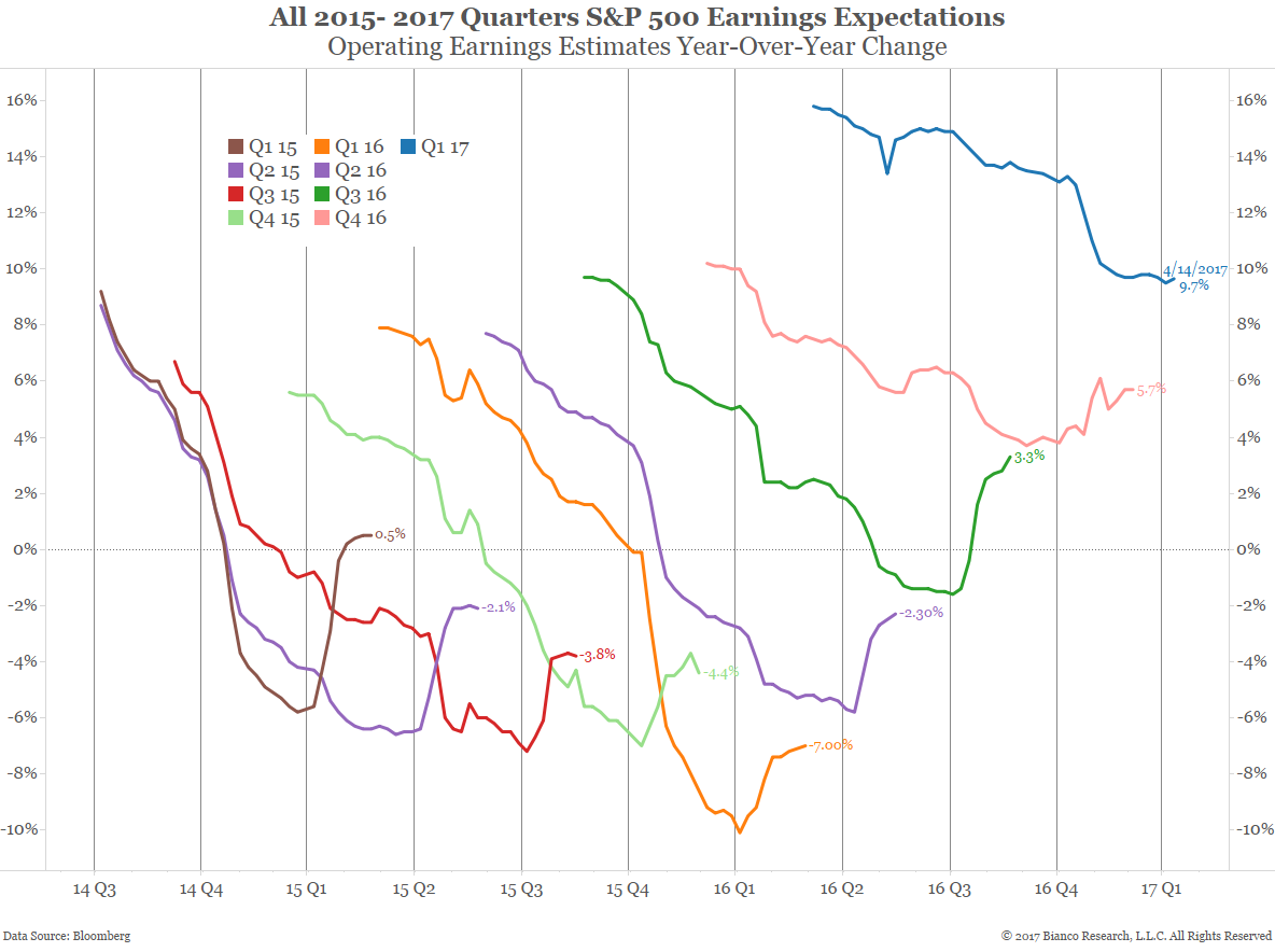 Through Friday only 29 of the S&P 500 have reported Q1 2017 earnings. The chart below shows blended earnings estimates, meaning it uses the 29 actual reports and the median estimate of Wall Street analysts for the 471 that have not yet reported.