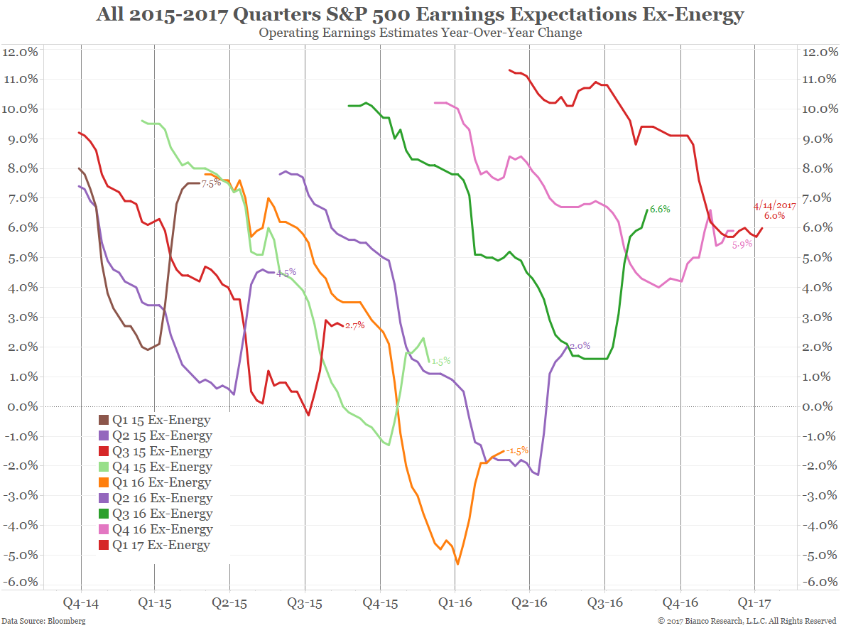 However, the next chart shows ex-energy earnings estimates since Q1 2015. When looked at from this perspective, earnings estimates have not improved much this quarter. Ex-energy earnings actually peaked in Q3 2016 (green) at 6.6%, fell to 5.9% in Q4 2016 (pink) and are expected to be roughly the same at 6.0% for Q1 2017 (red).