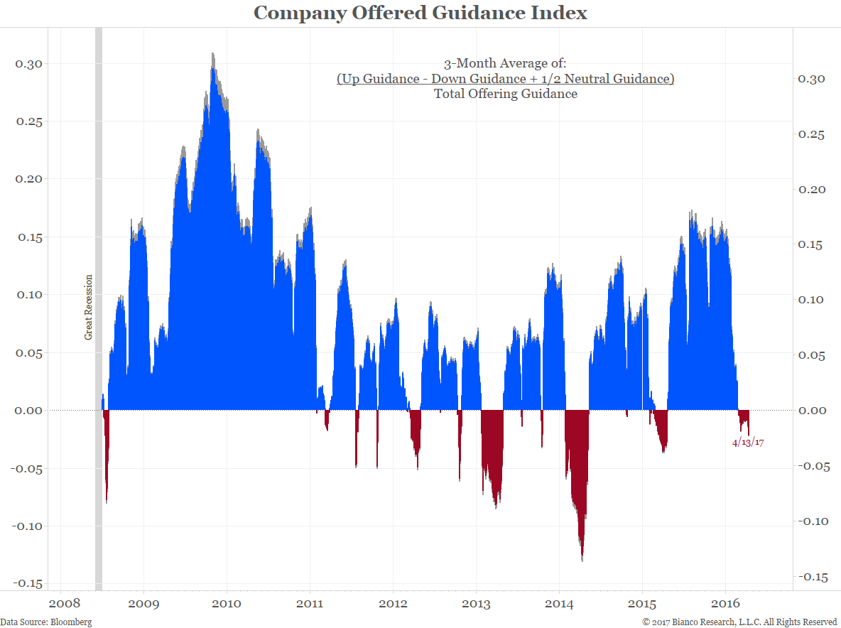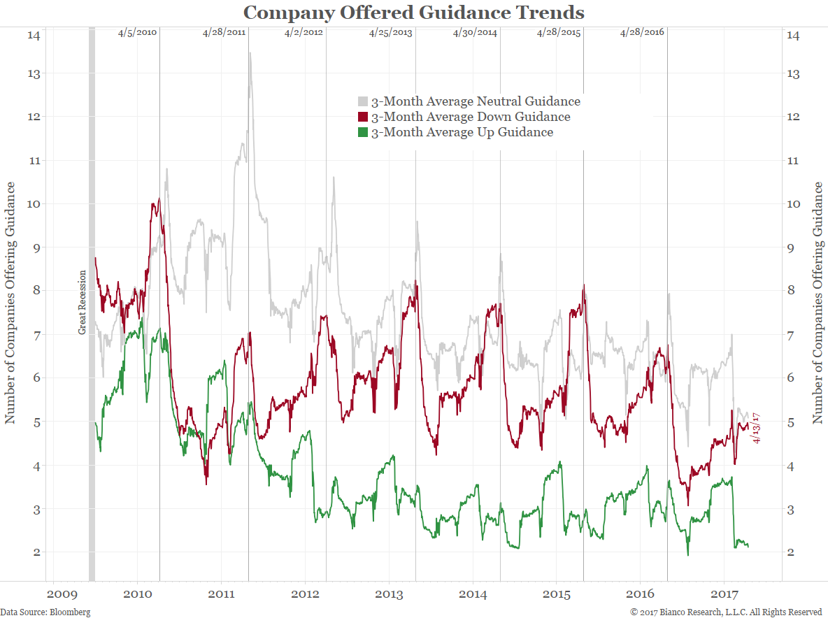 The chart below shows the individual inputs used to create the chart above. Note the seasonal pattern. Companies typically offer more positive guidance in January (rising green line). However, by April, negative guidance is usually on the rise (rising red line).