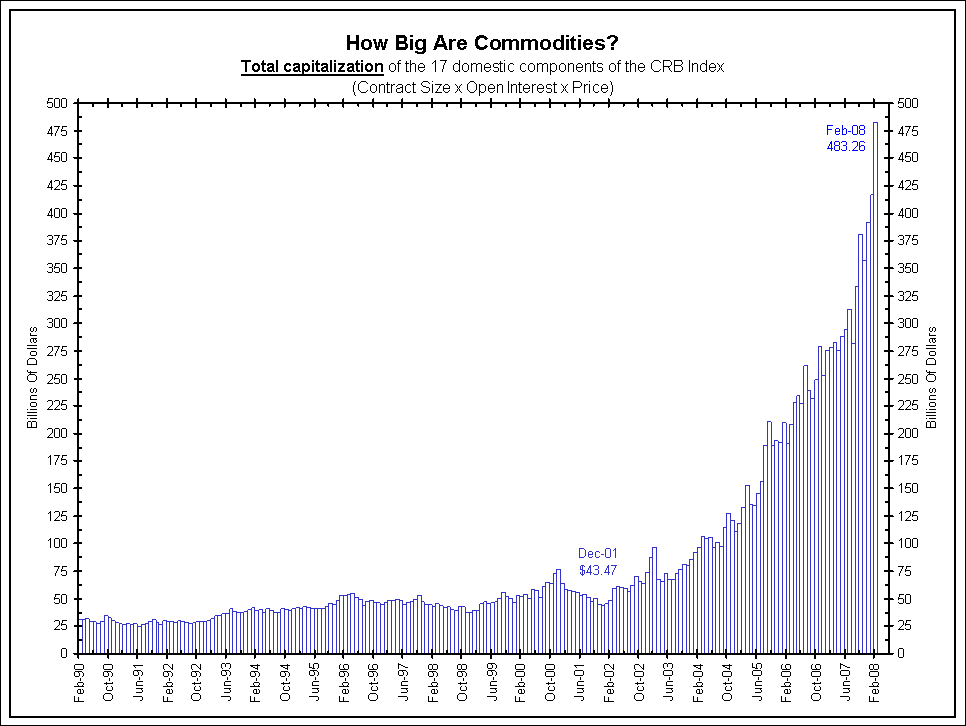 By these rough estimations, money in long-only commodity index funds has increased by more than $183 billion, more than double, between January 16, 2007 and March 11, 2008. At over $336 billion in long index positions as of March 11, 2008, index trading accounts for almost 70% of all the money in the commodities market as measured by the CRB as calculated on Page One. These numbers are even more impressive considering long-only commodity index funds essentially did not exist before this decade.