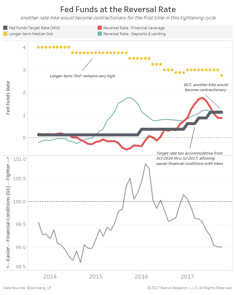 The fact the fed funds rate resided below the reversal rates from October 2016 through July 2017 is the best explanation we have seen for why financial conditions have eased. BUT, these reversal rates are now straddling 1%, meaning another hike would likely be contractionary for the first time in this tightening cycle.
