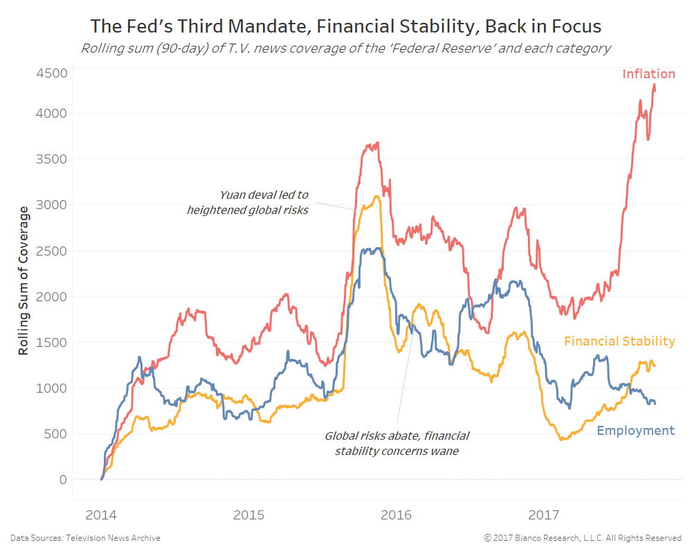 The next chart shows the rolling sum of T.V. news programming including ’employment,’ ‘inflation,’ and ‘financial stability’ while discussing the Federal Reserve. These frequencies offer a ranking of the Fed’s two mandates of stable prices and full employment along with the so-called third mandate of financial stability.