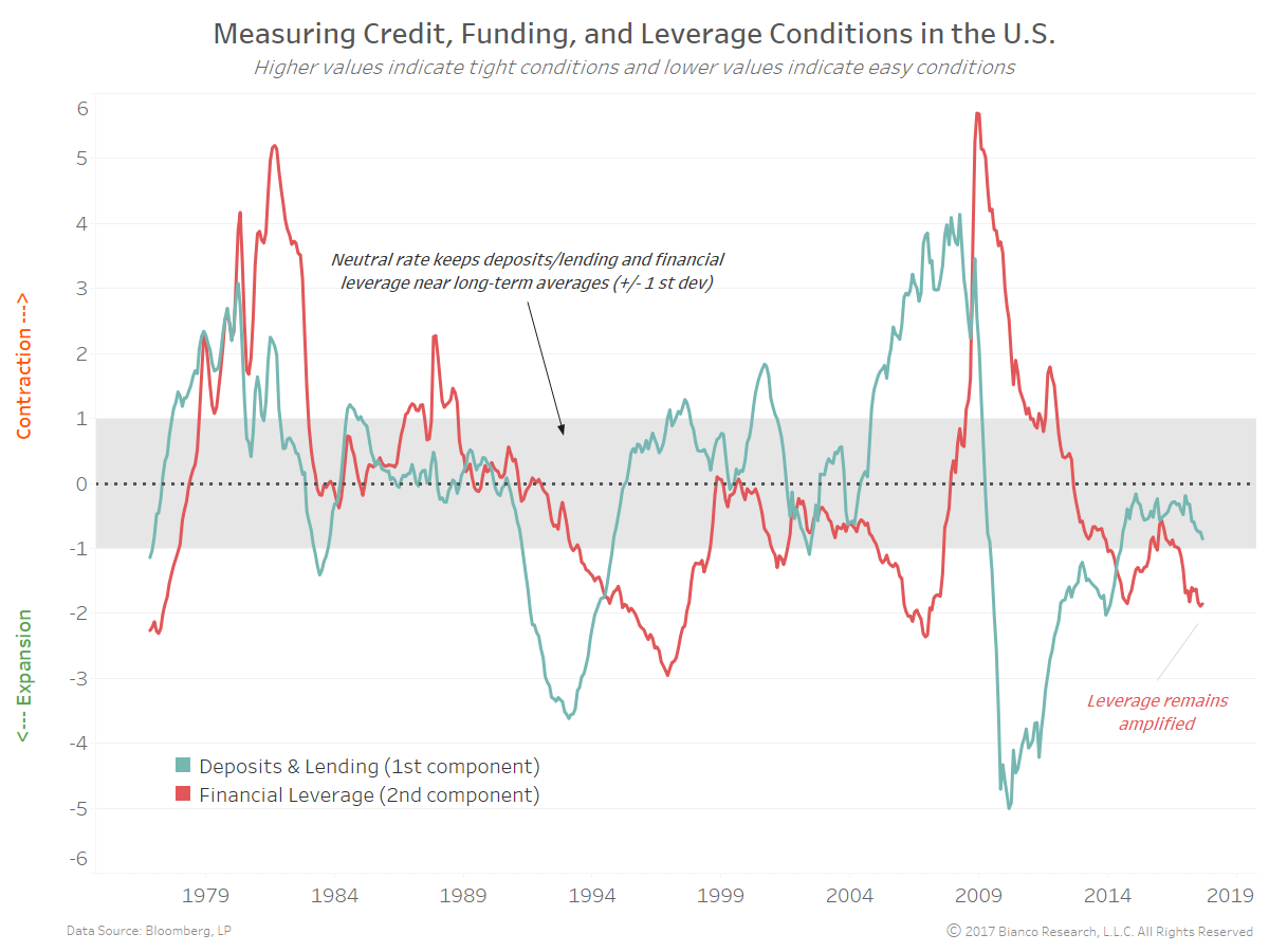 The chart below breaks financial conditions into deposits/lending growth (blue) and financial leverage/volatility (red). The gray-shaded area represents equilibrium defined as +/- 1 standard deviation from long-term averages. Values above this band are contractionary, while below too expansionary.