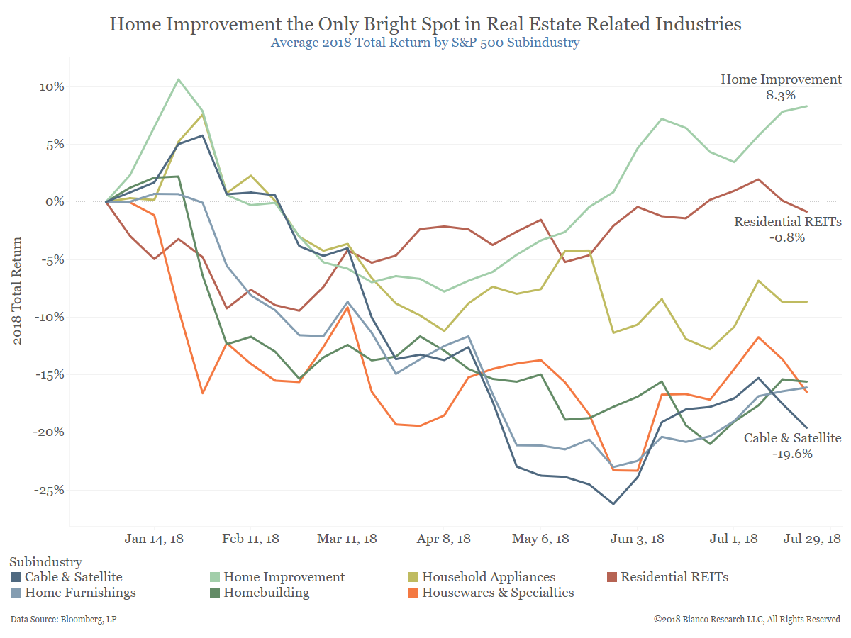 Steady new home sales growth and cooling existing home sales are pushing homeowners to improve what they own. This is a recipe for outperformance by home improvement retailers. The last chart shows the average year to date total return for S&P 500 subindustries. Among real estate related subindustries, home improvement at +8.3% is an oasis of positive returns in an otherwise bleak landscape.