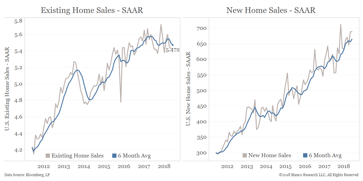 This week we’ll see home sales data for June with existing home sales due today and new home sales tomorrow. The charts below show the six-month average for each series in blue. Existing home sales saw this measure peak last April and has declined in each of the past two months. New home sales continue to grow, although constraints on labor and materials are increasingly problematic. These are conditions only the home improvement industry seems to thrive in.