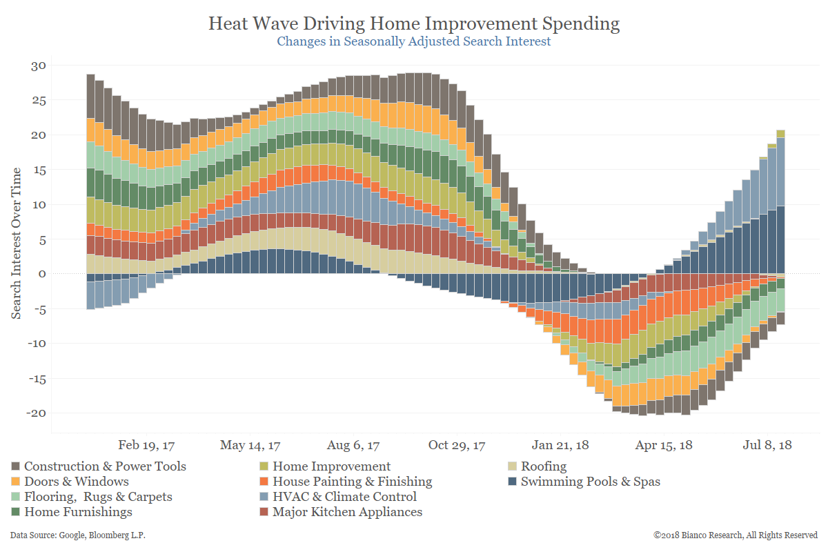 We mentioned last week that U.S. consumers were responding to the heat wave by getting outside and in the water. High temperatures also appear to be driving some consumers to consider an investment in cooling down. The chart below shows steadily rising traffic for air conditioning and swimming pools. We saw the same spike in interest in air conditioning in Canadian search trends on July 12.