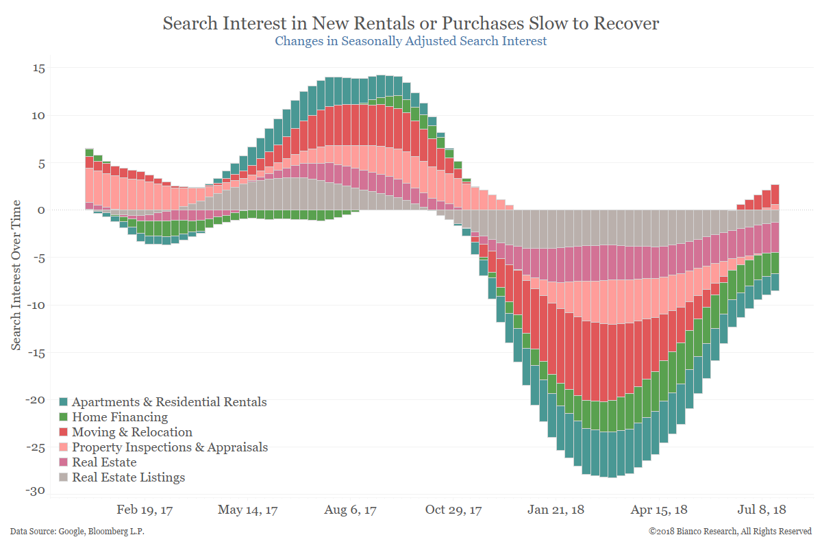 Google search trends for categories related to real estate purchases continue to weaken. The chart shows seasonally adjusted 6-month changes in search trends. Searches for moving and inspections are the exception, rising slightly versus six months ago. Search traffic for listings, financing, and rentals are all lower.