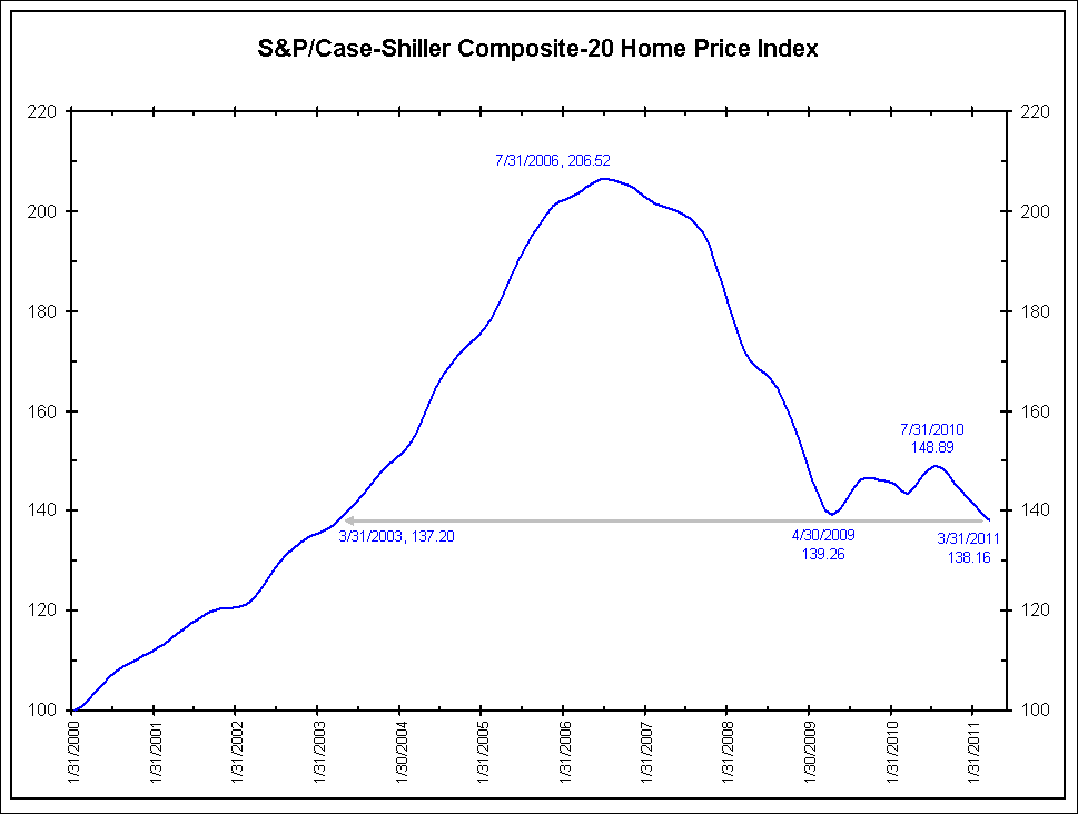 Home prices have sunk to 2002 levels, effectively wiping out almost a decade’s worth of home equity across the U.S. and imperiling the fragile economic recovery as Americans confront the falling value of their biggest investment. A closely watched home-price index released Tuesday, the S&P/Case-Shiller National Index, showed that prices nationwide fell 4.2% in the first quarter after declining 3.6% in the fourth quarter of 2010. The index had seen increases in 2009 and early 2010.”Home prices continue on their downward spiral with no relief in sight,” said David M. Blitzer, chairman of S&P’s index committee. The report signals “a double dip in home prices across much of the nation,” he said. That doesn’t bode well for the economy, which historically has depended on home buying and other consumer spending to rebound. Falling prices hurt economic growth in a number of ways. Not only do homebuyers curb spending when their homes are losing value, but continued price erosion keeps families stuck in homes they can’t sell because they are worth less than what they owe. - The Associated Press – Cities that weathered housing bust now suffering