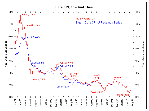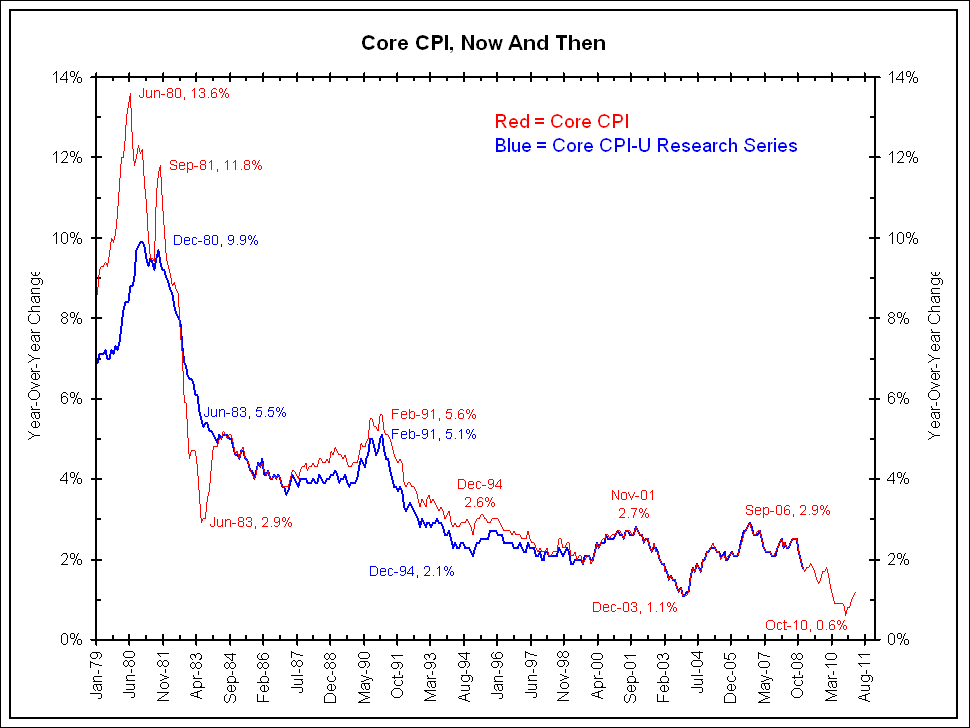 Below the same methodology is used to create a similar series for Core CPI. Again, if the current weights and methodologies used today were used in 1980, inflation would have been much lower. The Core CPI-U Research Series peaked at 9.9% in December 1980 as opposed to the regular Core CPI peak of 13.6% in June 1980.