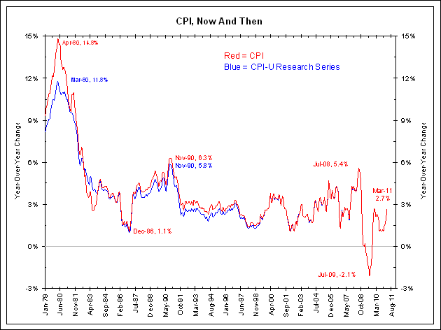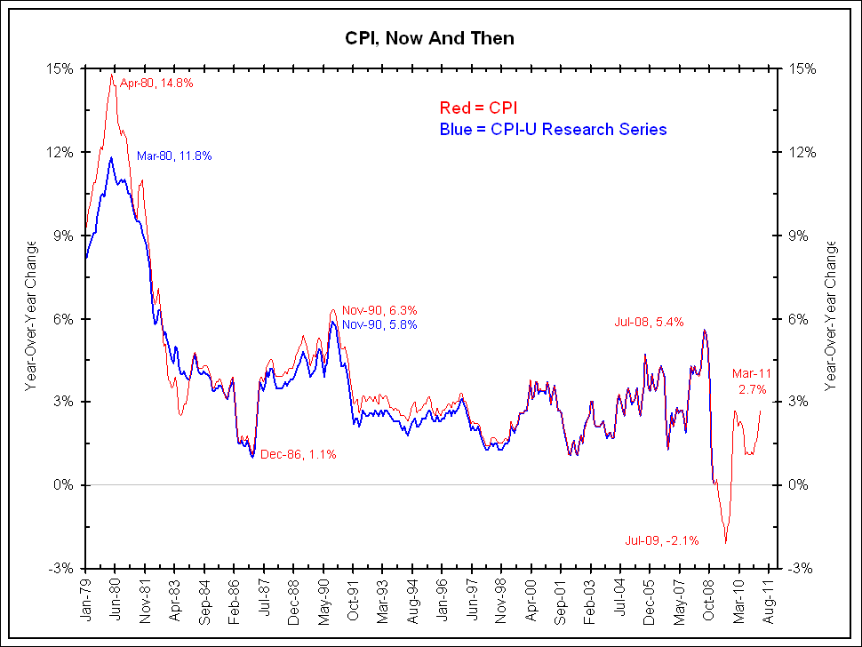 Based on detailed BLS estimates of the impact of its methodological changes over time, published in the Monthly Labor Review, June 1999 (“Consumer Price Index research series using current methods, 1978-98,” by Kenneth J. Stewart and Stephen B. Reed), SGS has reworked the CPI-U series to remove the impact of the various methodological changes. The following two graphs show the results of that analysis.