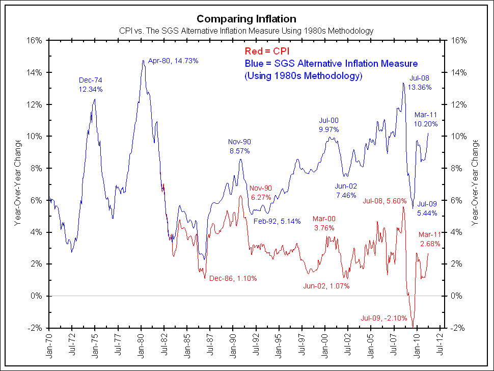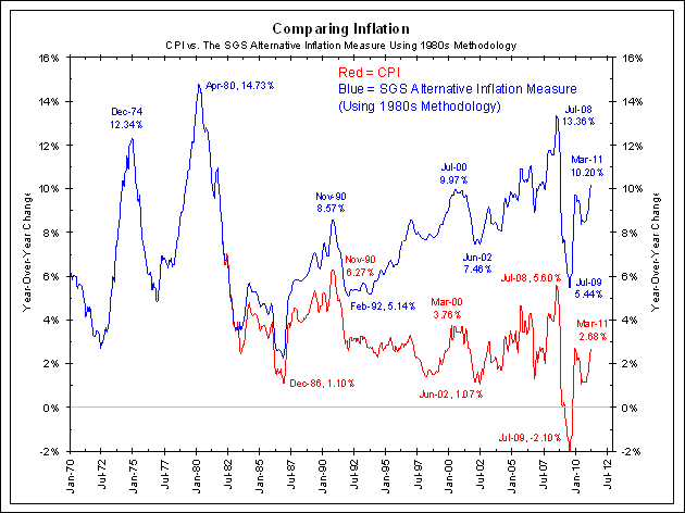 But what if we wanted to know what the inflation rate would be today based on the index rules used in the past? To get this answer, we must turn to Shadow Government Statistics. This website, run by economist John Williams, calculates CPI using the same methodology used in 1980.