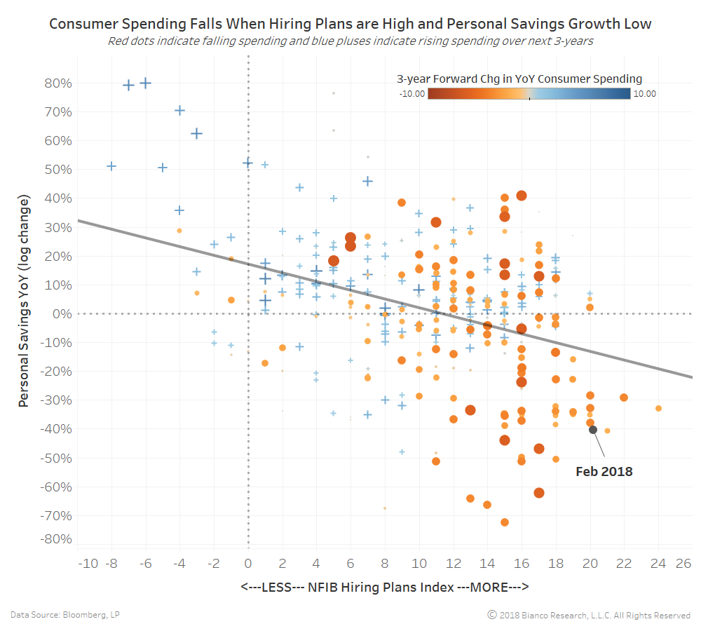 The chart below shows the NFIB’s Hiring Plans Index on the x-axis versus the year-over-year log change in the U.S. personal savings rate. The size and color of each instance indicate the change in year-over-year consumer spending over the following three years. Larger, darker red dots indicate consumer spending has fallen in the following three years.