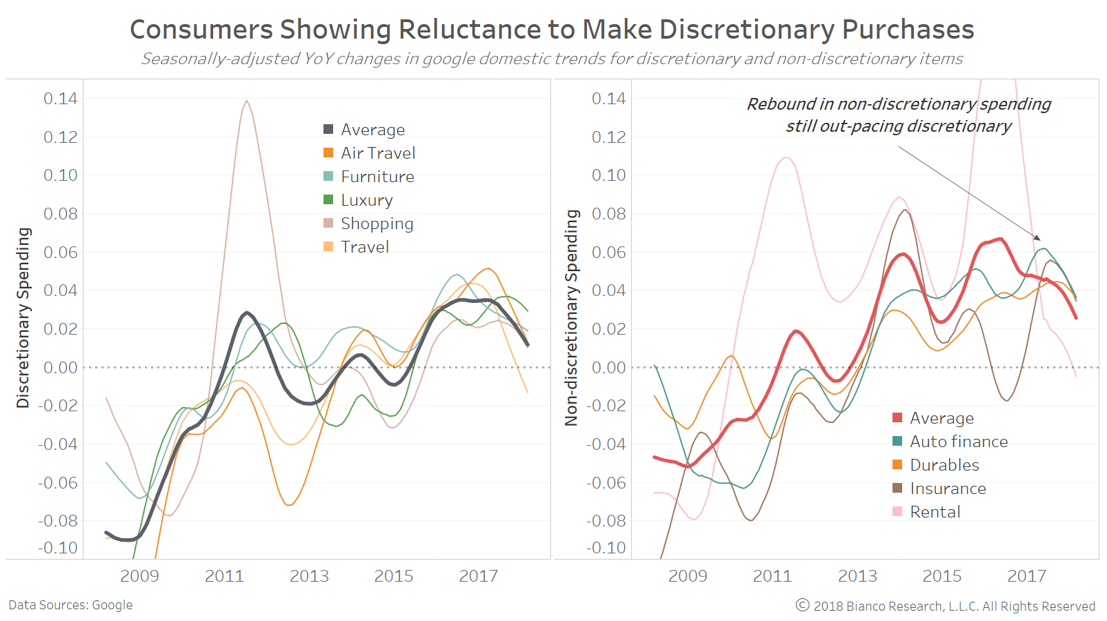 - Non-discretionary purchases like shopping, luxury goods, and travel have slowed to begin 2018